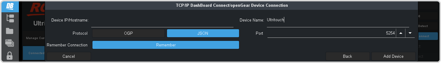 Tap Add > TCP/IP DashBoard Connect/openGear Device Connect.