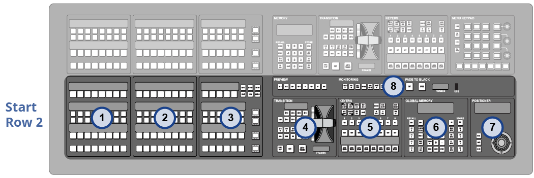 Press a button on all the modules that you want to assign to the selected row starting with the first source button/crosspoint module on the left. Remember to include memory and