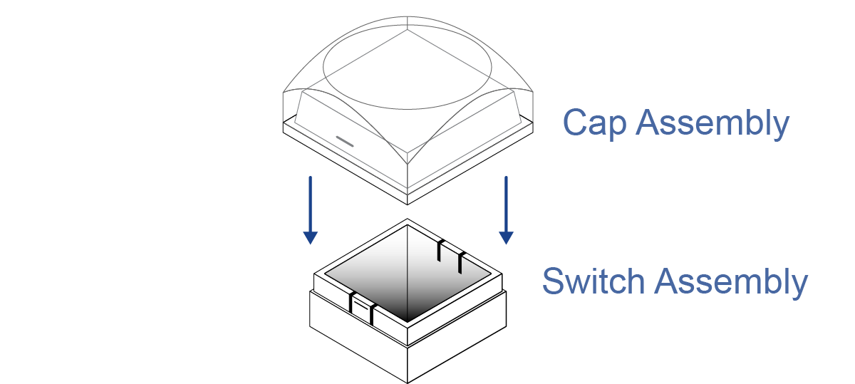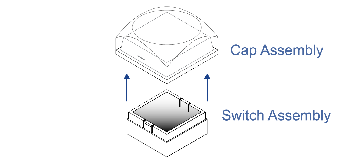 Aligning the notches on the sides of the Cap Assembly to the tabs on the side of the Switch Assembly, press Cap Assembly down onto the Switch Assembly with a rolling motion until they
