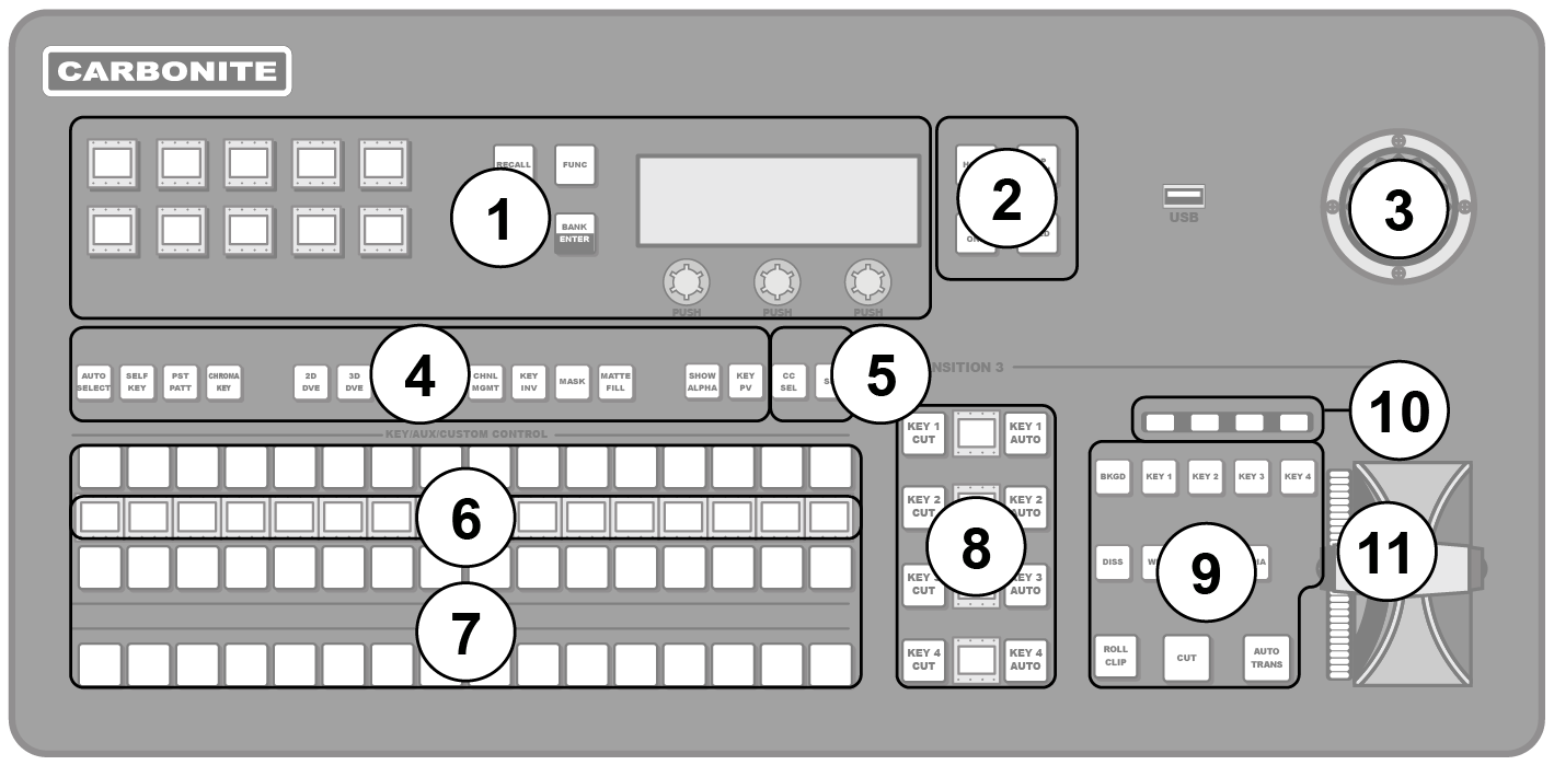 Each Carbonite Black control panel is made up of a number of distinct areas that control different aspects of the switcher. Some of these areas may vary in size or function, depending on the control panel you have.