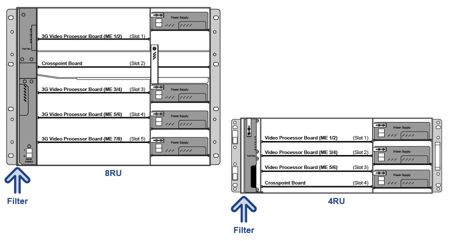 - Remove the 3G Video Processor board for the ME that you are installing the 3D DVE Channel card for. The slot that the board is installed in defines the ME it supports.