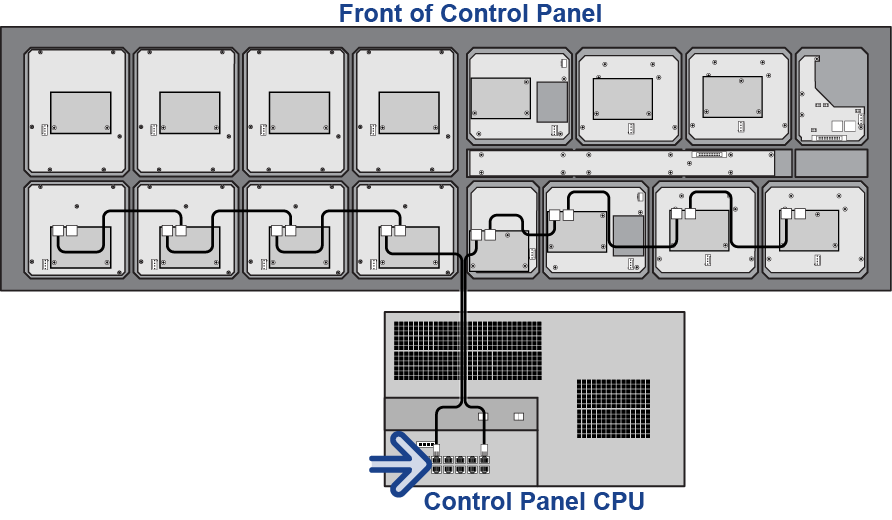 Using the network cables provided, connect a cable from an available port on the Control Panel CPU and the PREV port on the