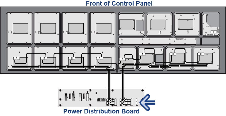 Using the power cables provided, connect a cable from an available port on the Power Distribution board and the power