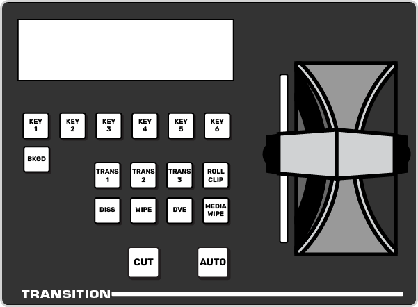 The transition area is used to select which video source buses will be included in the next transition and what type of transition will be performed. The Cut and Auto buttons and the fader are used to perform transitions.