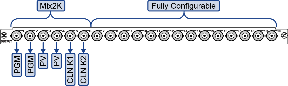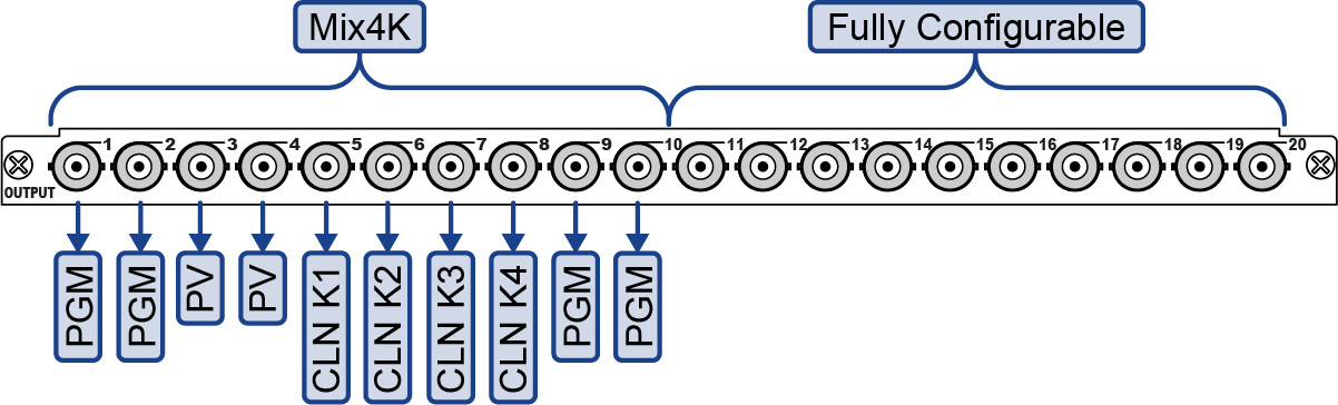 The number of keys depends on how the Mix/DSK option is set up. If Mix/DSK is set to Mix2K there are 2 keys and if it is set to Mix4K there are 4 keys. Both of these options lock specific output BNCs to the video signals being output by the Mix/DSK option.