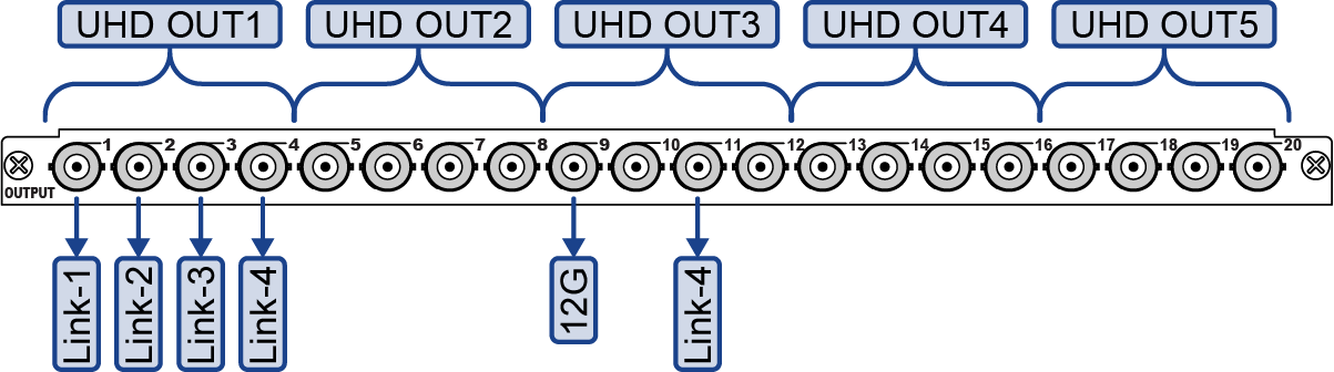 When the output group is set to 12Gb/s, the first BNC in the group outputs the 12Gb/s UHDTV1 stream and the third BNC outputs one of the sub images (links) at 3Gb/s as a camera return.