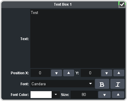 Tip: Use the Up and Down arrows to nudge the values by one.- Text: — enter the line of text you want to appear in the box. A text box can only contain a single line of text.