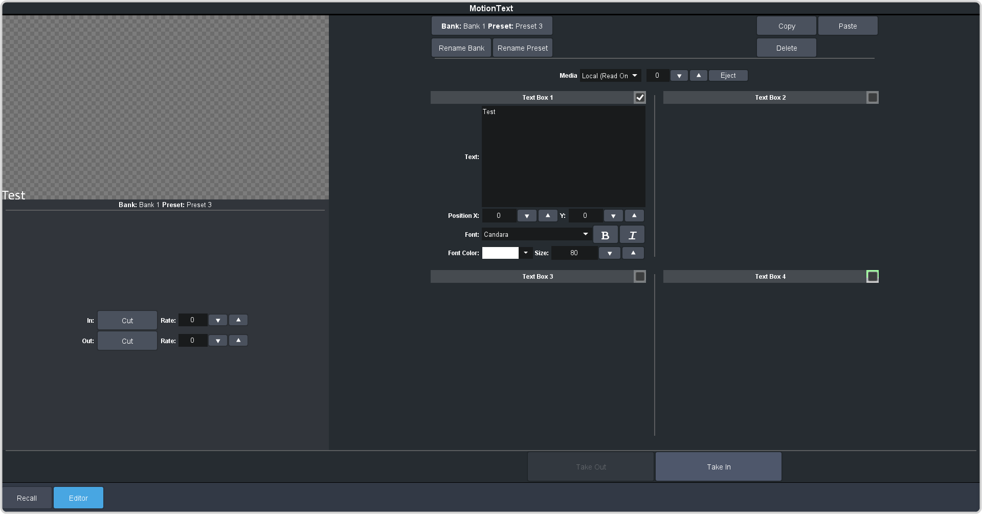 Tip: If you want to preview the text on a video output, you can select Text as a source and click Take In. The MotionText output updates in real-time on the output.