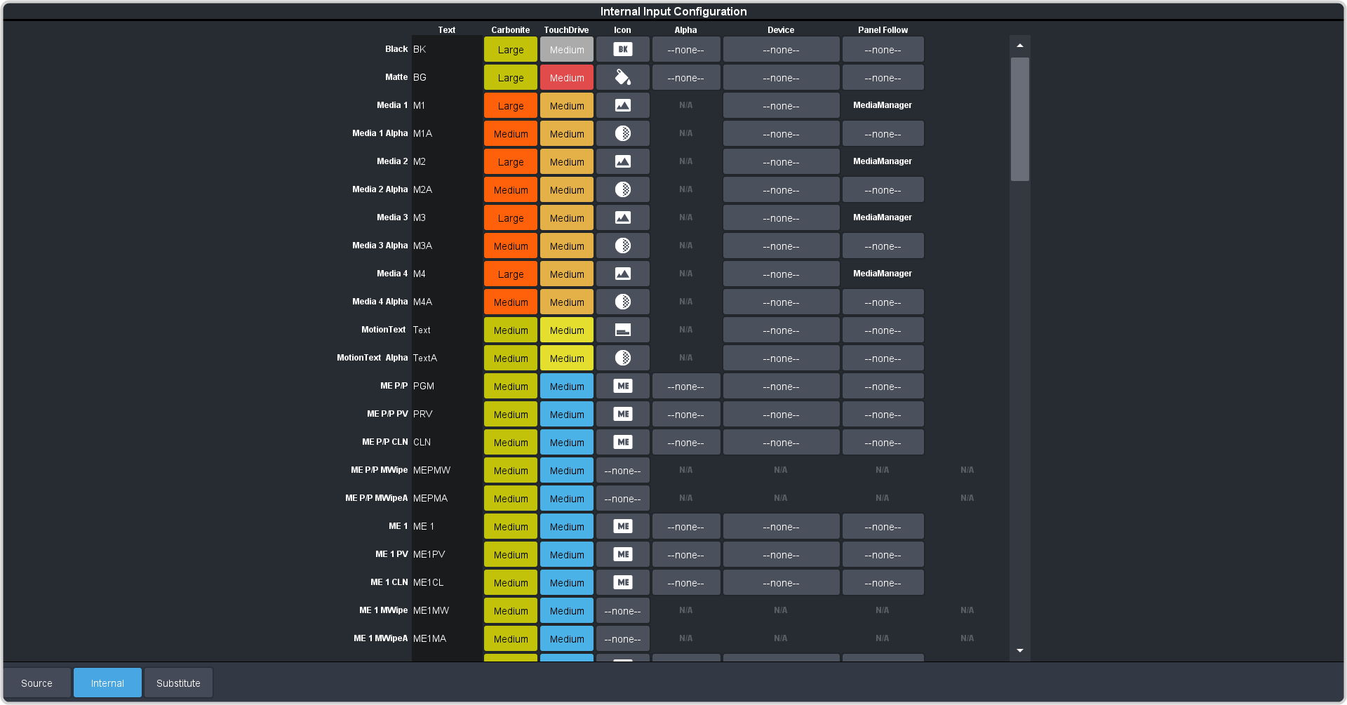 The internal sources are listed along the side and the various settings are listed across the top. Click the setting button for the source you want to set up to view the available