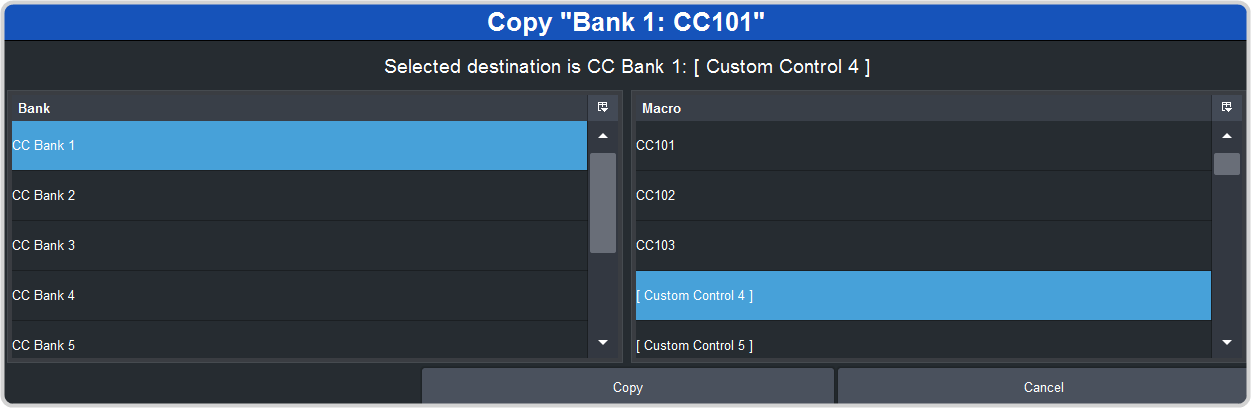 The contents, or events, of a custom control can be copied from one custom control and pasted to another. Along with the events, the name and mnemonic settings are also copied.