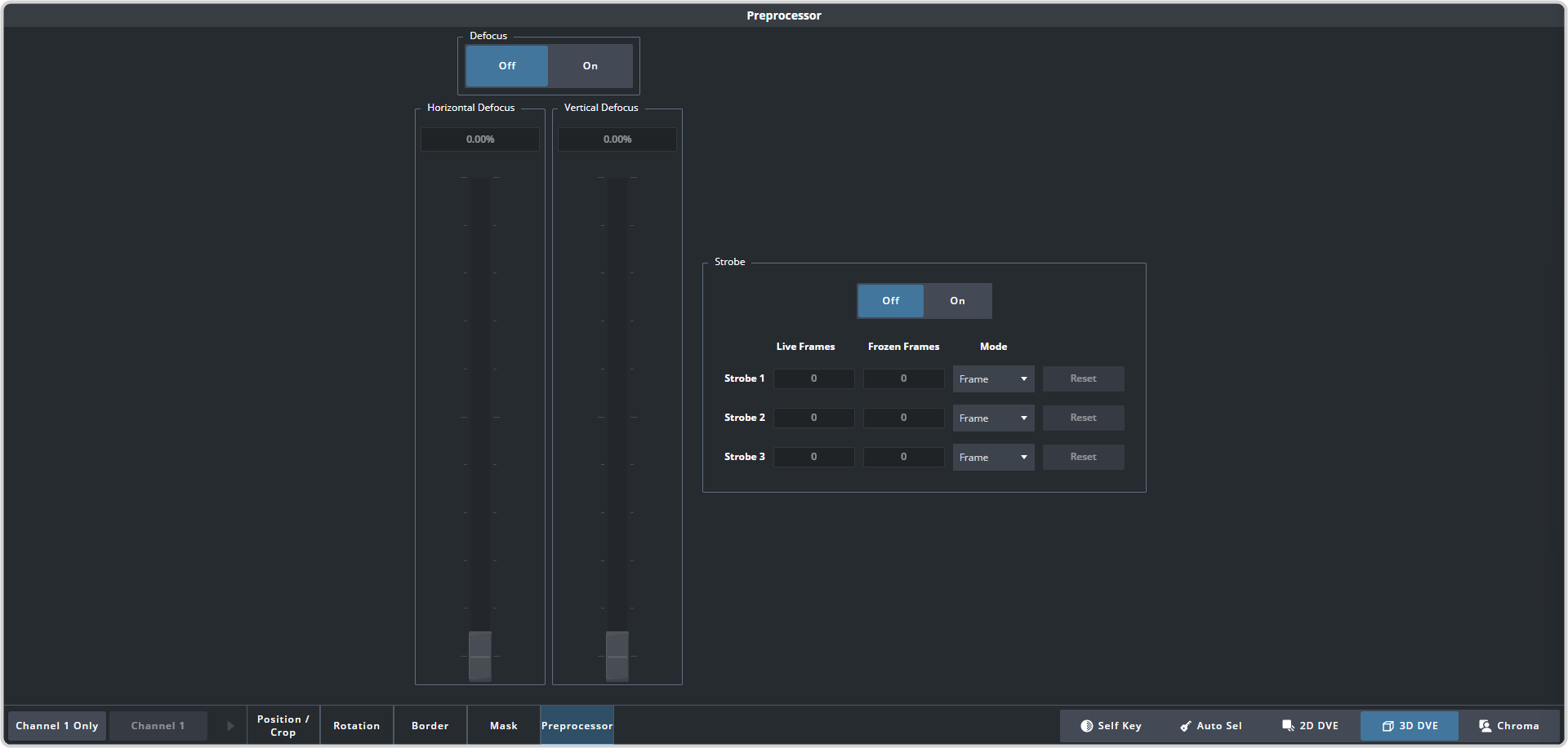 The Strobe effect alternates between freezing and playing the live video of the channel. There are three strobe generators that can be used to apply a serialized strobe to create various