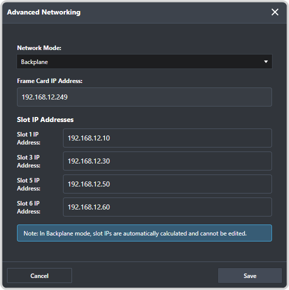 - Slot IP — the fixed internal IP address (Backplane) or configurable external IP address (External) of each