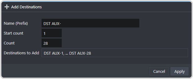 - Name (Prefix) — enter DST AUX- or how you want the name for the aux bus to appear.