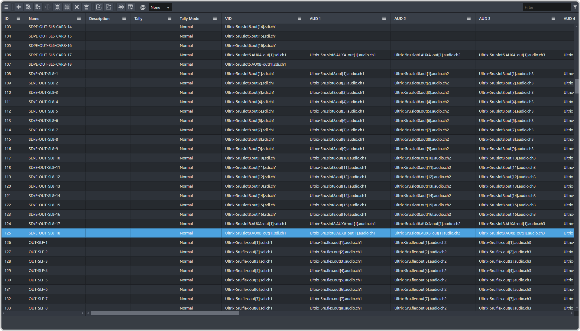 - For each of the new sources you need to add a custom VID. The VIDs must follow the format <router-name>.slot0.virt-out[aux].sdi.ch1. For example, aux 7 on bank 4 for the router being used for this example would be Ultrix-5ru.slot0.virt-out[31].sdi.ch1.