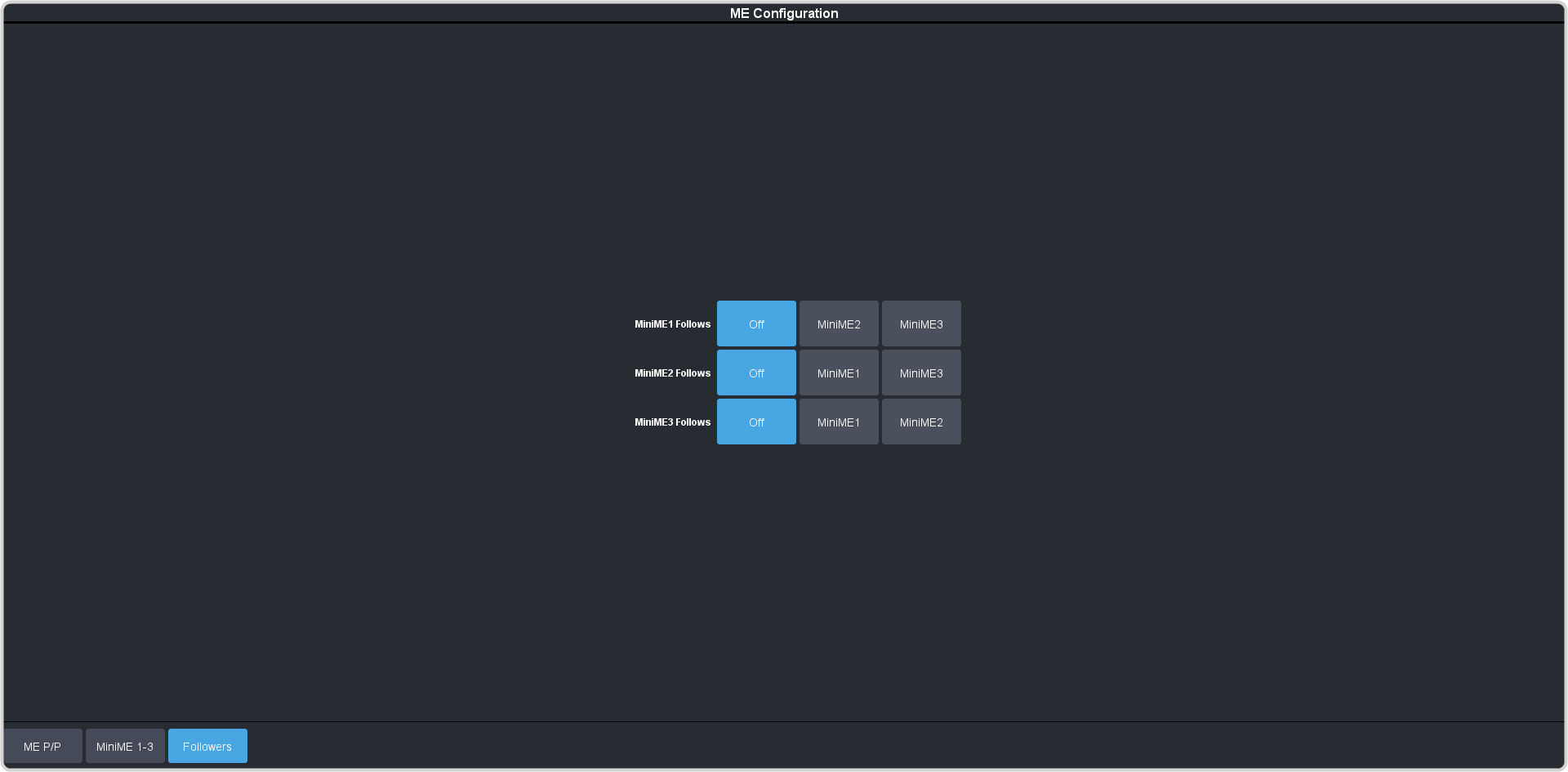- You cannot cascade/re-enter follows. For example, if MiniME™ 1 is following MiniME™ 2, MiniME™ 2 cannot be set to following anything and no other MiniME™ can follow MiniME™ 1.