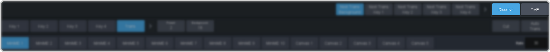 Important: The Cut and Auto buttons trigger a transition on what has been selected. If Trans is selected a normal background transition is performed. If one of the keyers is selected (Key X) a key-only transition is performed on the selected key.
